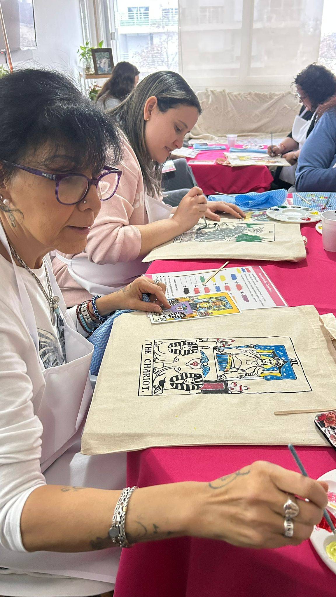 Comenzamos conectando con el Arcano de nacimiento de cada una. A partir de ese arquetipo del tarot, cada participante pintó su propia interpretación sobre una tote bag de algodón, transformando ese símbolo en una pieza única, cargada de intención y significado.